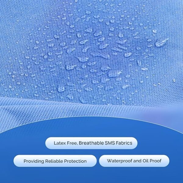 2. The SMS material (35g, 45g,65g) consists of two layers of spunbond non-woven fabric (S) sandwiched by one layer of meltblown non-woven fabric (M): Which is waterproof, has high strength, tear resistance, good filtering performance, and comfortable breathability. The material is 100% polypropylene.