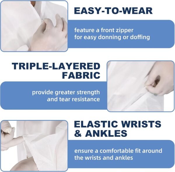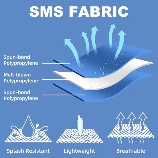 1. Strong protection: It adopts a three-layer SMS structure of spunbond – meltblown – spunbond. The meltblown layer intercepts droplets, dust and non-oily particles at a high density.